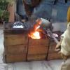 Ceramic pieces being removed from the kiln while glowing hot and placed in trash cans filled with combustible materials. This process causes the glazed areas to have a metallic effects and the exposed clay areas to turn matte black.